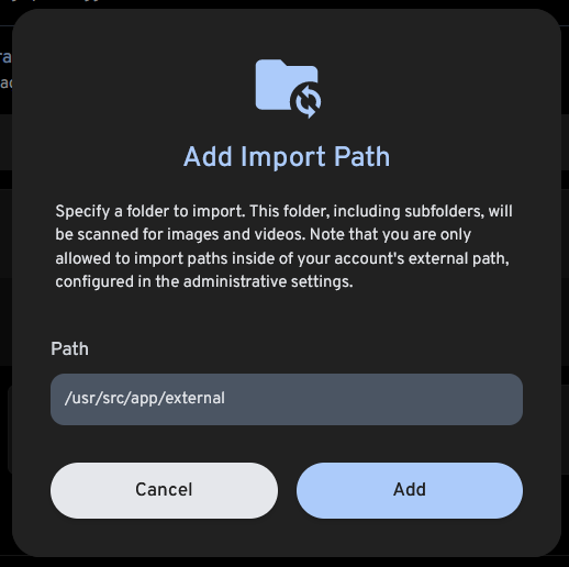Notice this matches the path inside the container where we mounted your photos. The purpose of the external path field is for administrators who have multiple users on their Immich instance. It lets you prevent other authorized users from navigating to your external library.